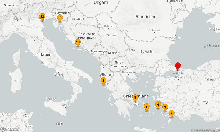 Die Reiseroute startet am 28. Mai 2026 in Istanbul (Türkei) und führt Sie vom 28. Mai 2026 bis zum 08. Juni 2026 (11 Tage) nach Venice (Fusina) (Italien).