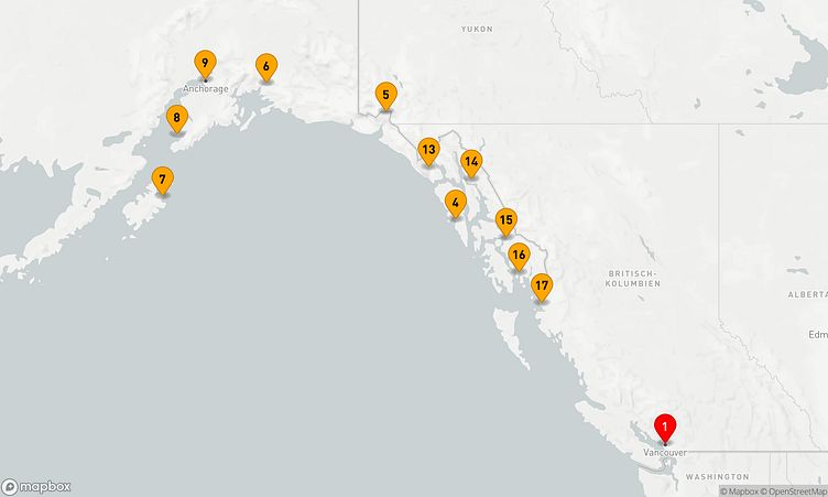 Nach Ihrem Start am 16. September 2026 in Vancouver (Kanada) führt Sie die Route über 18 Tage bis zu Ihrem Zielhafen Vancouver (Kanada), wo Sie am 04. Oktober 2026 ankommen.