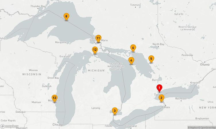 Auf Ihrer Reise besuchen Sie unter anderem die Häfen von Toronto, Tobermory und Oberer See, wo spannende Eindrücke von Land und Kultur auf Sie warten.