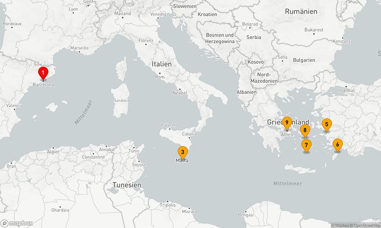 Auf Ihrer Reise besuchen Sie unter anderem die Häfen von Barcelona, Valletta und Rhodos, wo spannende Eindrücke von Land und Kultur auf Sie warten.