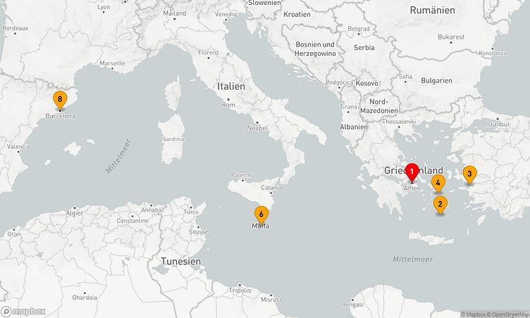 Ab Athen (Piräus) (Griechenland) starten Sie am 01. November 2027 und erreichen nach 7 Tagen den Zielhafen Barcelona (Spanien), wo Ihre Reise endet.