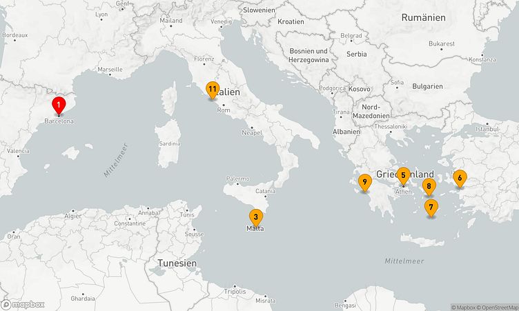 Freuen Sie sich auf Anläufe in Häfen wie Barcelona, Valletta und Kusadasi, die Ihnen authentische Einblicke und besondere Erlebnisse bieten.