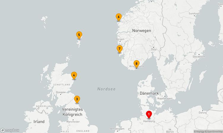 Während der Reise besuchen Sie unter anderem die Häfen von Hamburg, Newcastle upon Tyne und Shetlandinseln, die Ihnen spannende Eindrücke und einzigartige Entdeckungen bieten.