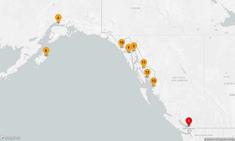 Während der Route halten Sie unter anderem in den Häfen von Vancouver, Valdez und Icy Strait Point - Hoonah, um in das Flair und die Besonderheiten der Umgebung einzutauchen.