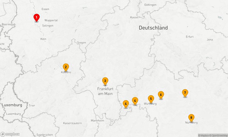 Während der Route halten Sie unter anderem in den Häfen von Düsseldorf, Frankfurt am Main und Würzburg, um in das Flair und die Besonderheiten der Umgebung einzutauchen.