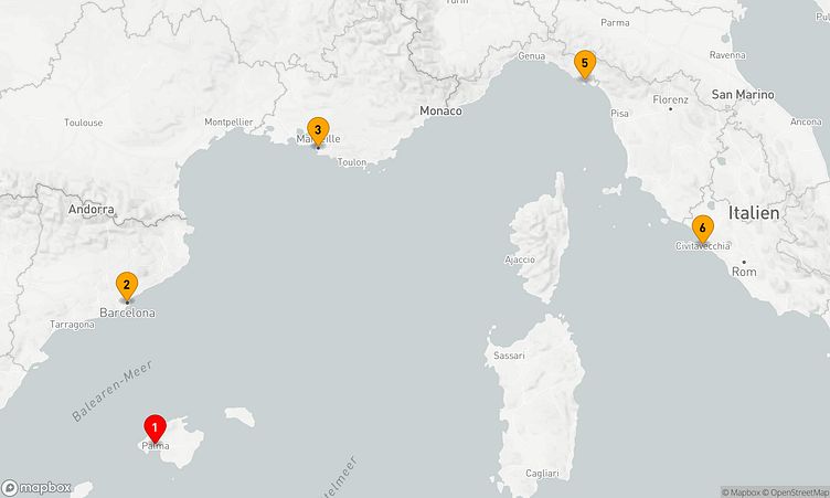 Während der Reise besuchen Sie unter anderem die Häfen von Palma de Mallorca, Barcelona und La Spezia, die Ihnen spannende Eindrücke und einzigartige Entdeckungen bieten.