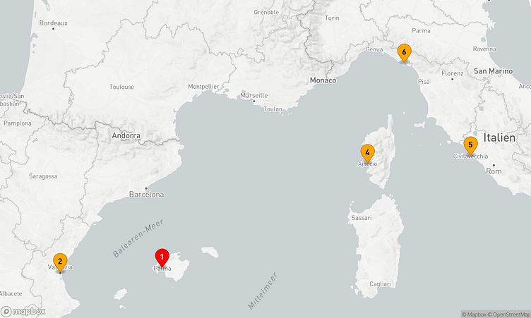 Freuen Sie sich auf Anläufe in charmanten Häfen wie Palma de Mallorca, Valencia und Rom / Civitavecchia, die authentische Einblicke und außergewöhnliche Erlebnisse versprechen.
