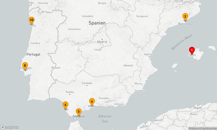 Auf Ihrer Reise besuchen Sie unter anderem die Häfen von Palma de Mallorca, Barcelona und Gibraltar, wo spannende Eindrücke von Land und Kultur auf Sie warten.