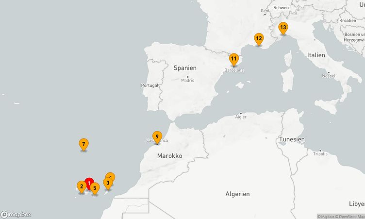 Der Start erfolgt am 06. April 2026 in Santa Cruz de Tenerife (Spanien). Über 12 Tage führt Sie die Route bis zu Ihrem Zielhafen Savona (Italien), wo Sie am 18. April 2026 ankommen.
