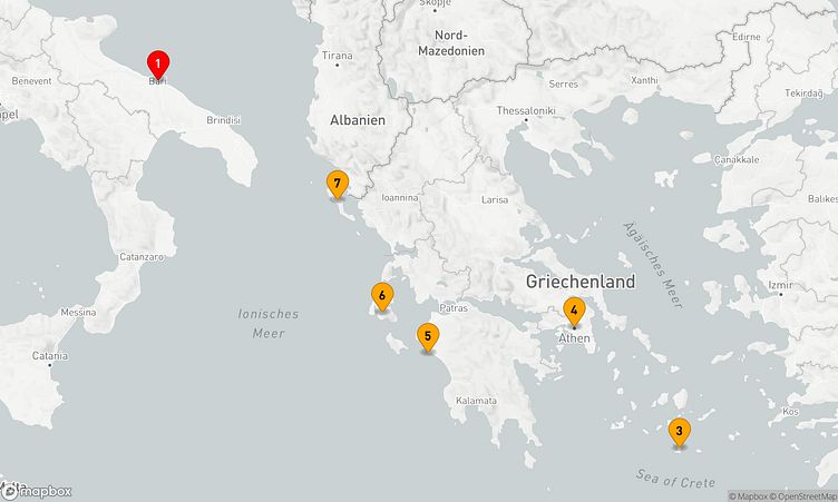 Ihre Route führt Sie unter anderem zu den faszinierenden Häfen von Bari, Santorin und Katakolon, wo Sie die Atmosphäre und das Leben vor Ort hautnah erleben können.