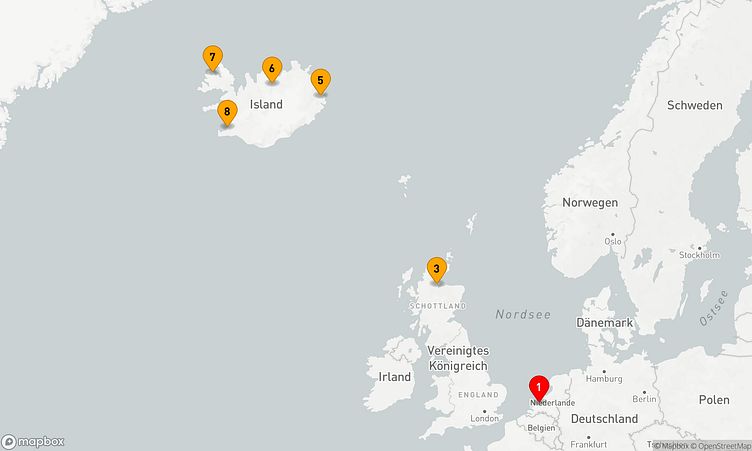 Am 15. August 2027 beginnt Ihre Reise in Rotterdam (Niederlande), und nach 7 Tagen erreichen Sie am 22. August 2027 den Hafen von Reykjavík (Island).