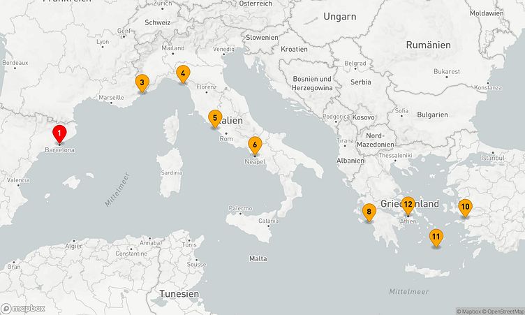 Freuen Sie sich auf Anläufe in Häfen wie Barcelona, La Spezia und Katakolon, die Ihnen authentische Einblicke und besondere Erlebnisse bieten.