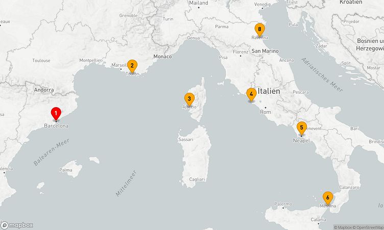 Während der Fahrt besuchen Sie unter anderem die Häfen von Barcelona, Toulon und Rom / Civitavecchia, die Ihnen beeindruckende Eindrücke und besondere Entdeckungen bieten.