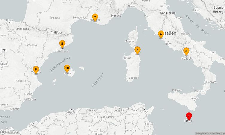 Während Ihrer Reise besuchen Sie unter anderem die Häfen von Valletta, Neapel und Olbia, die Ihnen spannende Eindrücke und einzigartige Entdeckungen bieten.