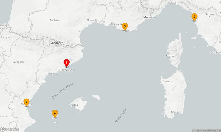 Die Reiseroute beginnt am 18. Mai 2026 in Barcelona (Spanien) und führt sie vom 18. Mai 2026 bis zum 25. Mai 2026 (7 Tage) nach Barcelona (Spanien).