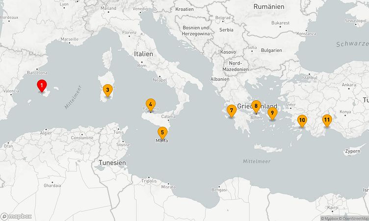 Nach Ihrem Start am 01. Oktober 2026 in Palma de Mallorca (Spanien) führt Sie die Route über 10 Tage bis zu Ihrem Zielhafen Antalya (Türkei), wo Sie am 11. Oktober 2026 ankommen.