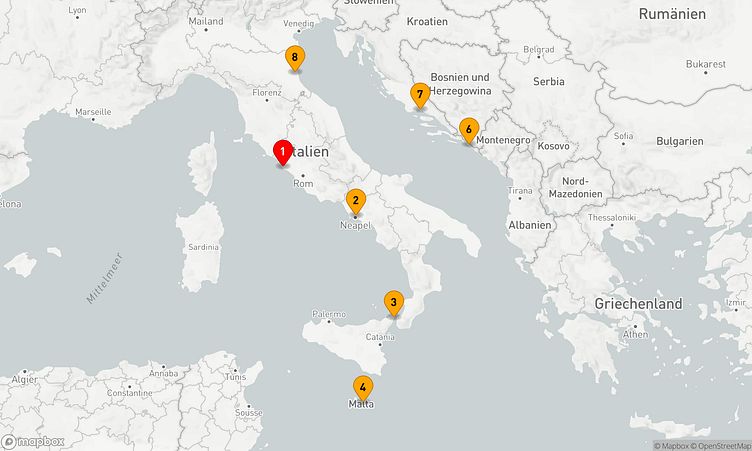 Während Ihrer Reise besuchen Sie unter anderem die Häfen von Rom / Civitavecchia, Neapel und Valletta, wo spannende Land- und Kultureindrücke auf Sie warten.