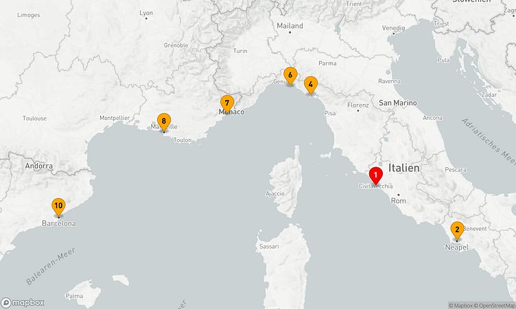 Die Reiseroute beginnt am 22. September 2026 in Rom / Civitavecchia (Italien) und führt Sie vom 22. September 2026 bis zum 01. Oktober 2026 (9 Tage) nach Barcelona (Spanien).