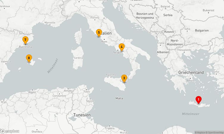 Am 07. November 2025 beginnt Ihre Reise in Heraklion (Griechenland), und nach 7 Tagen erreichen Sie am 14. November 2025 den Hafen von Palma de Mallorca (Spanien).