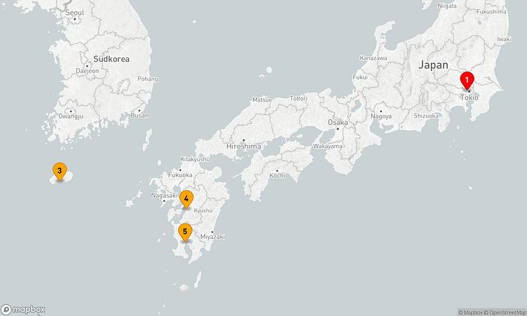 Auf Ihrer Reise besuchen Sie unter anderem die Häfen von Tokyo, Gangjeong (Seogwipo-si) und Kagoshima, wo spannende Eindrücke von Land und Kultur auf Sie warten.