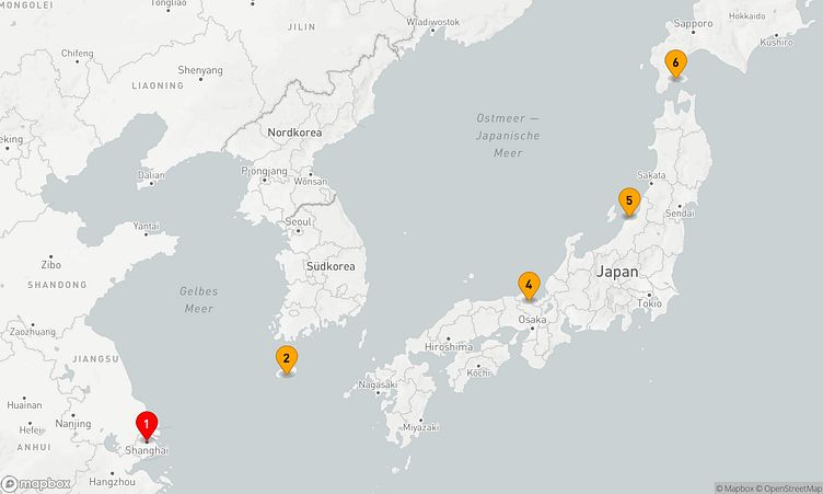 Während Ihrer Reise machen Sie Halt in faszinierenden Häfen wie Shanghai, Seogwipo und Niigata, die Ihnen unvergessliche Eindrücke und außergewöhnliche Entdeckungen ermöglichen.