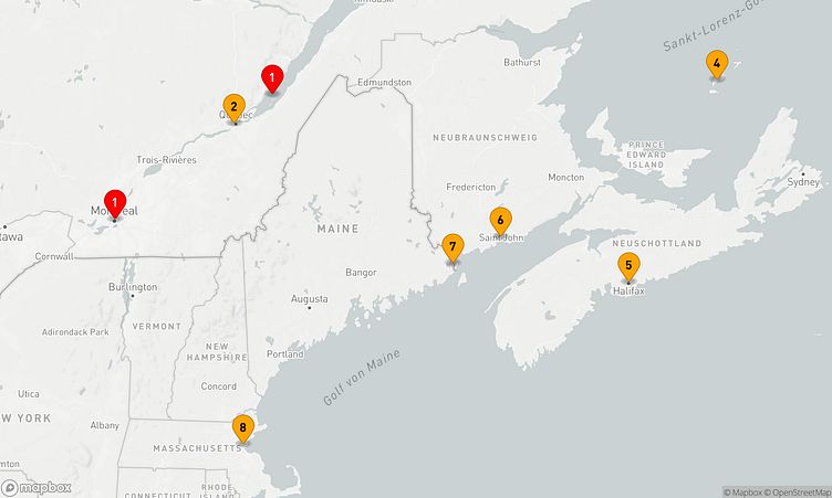 Die Reiseroute beginnt am 12. September 2026 in Montreal (Kanada) und führt sie vom 12. September 2026 bis zum 19. September 2026 (7 Tage) nach Boston (Vereinigte Staaten).