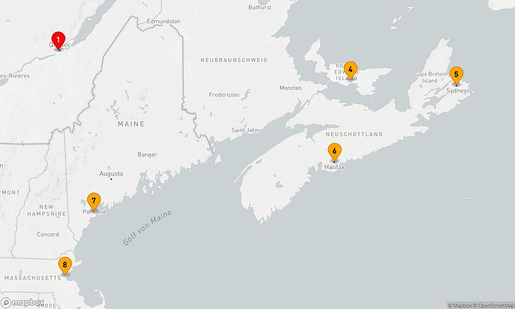 Ihre Reise startet in Québec (Kanada). Am 02. Mai 2026 legen Sie ab und erreichen nach 7 Tagen, am 09. Mai 2026, den Zielhafen Boston (Vereinigte Staaten).