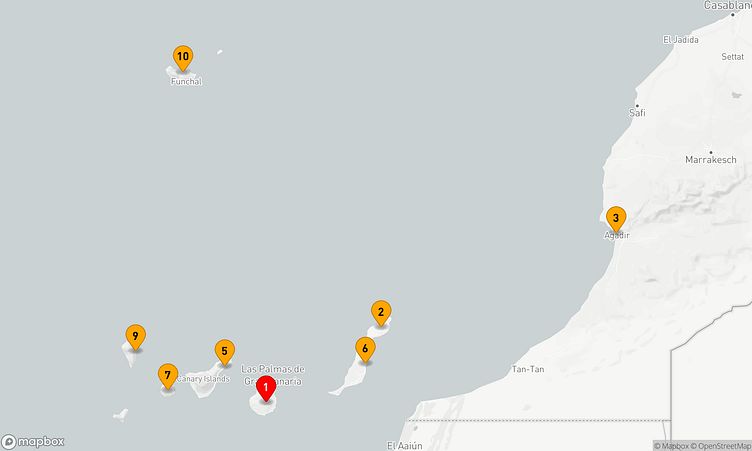 Auf Ihrer Reise besuchen Sie unter anderem die Häfen von Gran Canaria, Agadir und San Sebastián de La Gomera, wo spannende Eindrücke von Land und Kultur auf Sie warten.