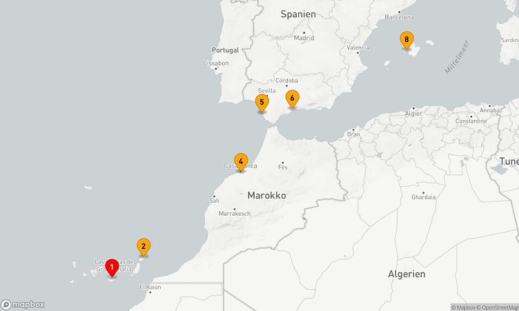 Ihre Route führt Sie unter anderem zu den faszinierenden Häfen von Gran Canaria, Arrecife / Lanzarote und Cádiz, wo Sie die Atmosphäre und das Leben vor Ort spüren können.