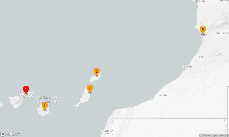 Während der Route halten Sie unter anderem in den Häfen von Santa Cruz de Tenerife, Arrecife / Lanzarote und Agadir, um in das Flair und die Besonderheiten der Umgebung einzutauchen.