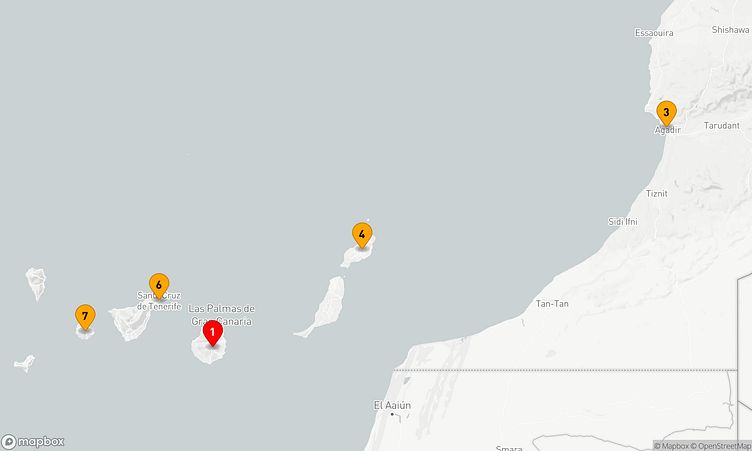 Auf dieser Reise besuchen Sie die Häfen von Gran Canaria, Agadir und Arrecife / Lanzarote, wo Sie lokale Sehenswürdigkeiten und beeindruckende Eindrücke entdecken können.