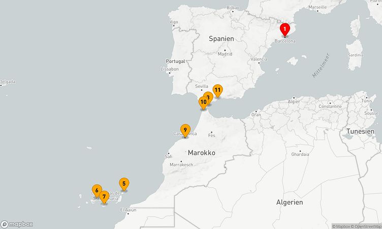 Auf dieser Reise besuchen Sie unter anderem die Häfen von Barcelona, Arrecife / Lanzarote und Casablanca, die Ihnen faszinierende Einblicke und einzigartige Entdeckungen ermöglichen.