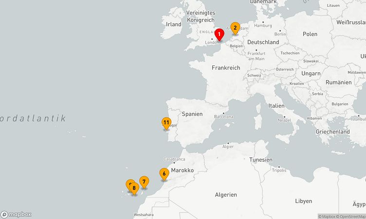 Diese Kreuzfahrt bringt Sie zu den beeindruckenden Häfen von Dover, Rotterdam und Arrecife / Lanzarote, die mit einzigartigen Sehenswürdigkeiten und lebendigen Eindrücken auf Sie warten.