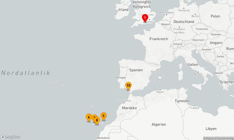 Die Reiseroute beginnt am 10. November 2025 in Southampton (Vereinigtes Königreich) und führt sie vom 10. November 2025 bis zum 22. November 2025 (12 Tage) nach Southampton (Vereinigtes Königreich).