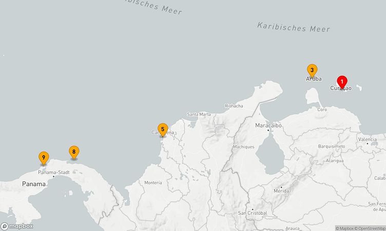 Von Willemstad (Curaçao) aus brechen Sie am 09. Februar 2027 auf, um nach 8 Tagen den Zielhafen Colón (Panama) zu erreichen, wo Ihre Reise endet.