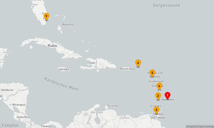 Von Bridgetown (Barbados) aus brechen Sie am 14. Dezember 2025 auf, um nach 8 Tagen den Zielhafen Miami (Vereinigte Staaten) zu erreichen, wo Ihre Reise endet.