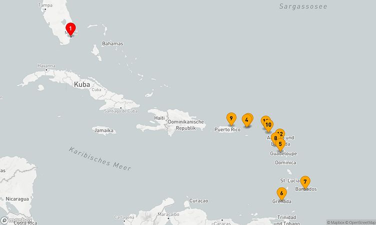 Während dieser Reise haben Sie die Gelegenheit, die Häfen von Miami, Deshaies und Little Bay zu erkunden, lokale Sehenswürdigkeiten zu entdecken und unvergessliche Eindrücke zu sammeln.