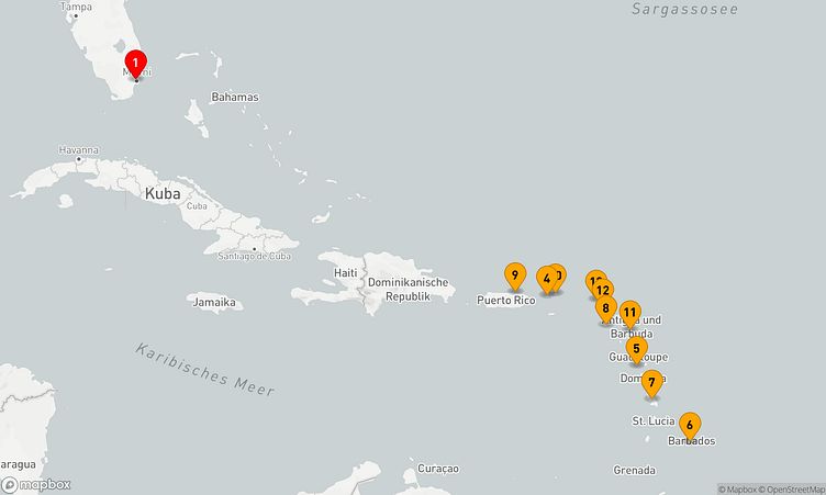 Diese Kreuzfahrt bringt Sie zu den beeindruckenden Häfen von Miami, Terre-de-Haut und Basseterre, die mit einzigartigen Sehenswürdigkeiten und lebendigen Eindrücken auf Sie warten.