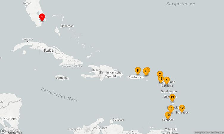 Während Ihrer Route legen Sie unter anderem in den Häfen von Miami, Saint John's und Bequia Insel an, um die Atmosphäre und die Besonderheiten dieser Orte zu erleben.