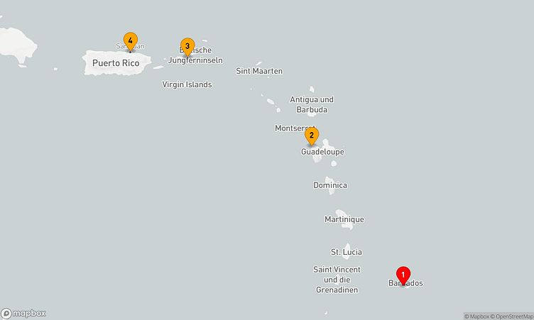 Am 17. Februar 2026 startet Ihre Kreuzfahrt in Bridgetown (Barbados) und nach drei Tagen, am 20. Februar 2026, erreichen Sie San Juan (Puerto Rico).