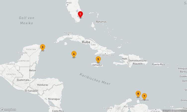 Ihre Route führt Sie zu faszinierenden Häfen wie Miami, Cozumel und Ocho Rios, wo Sie die lokale Atmosphäre und das lebendige Treiben vor Ort erleben können.