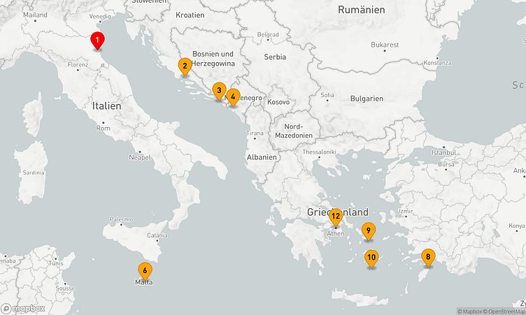 Auf der Route besuchen Sie unter anderem die Häfen von Ravenna, Dubrovnik und Rhodos, um die Atmosphäre und Besonderheiten der jeweiligen Orte zu entdecken.