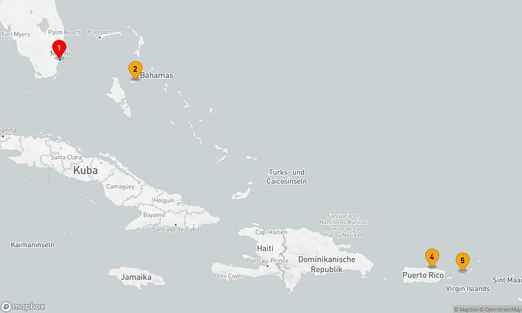 Während der Route halten Sie unter anderem in den Häfen von Miami, Nassau und Saint Thomas, um in das Flair und die Besonderheiten der Umgebung einzutauchen.