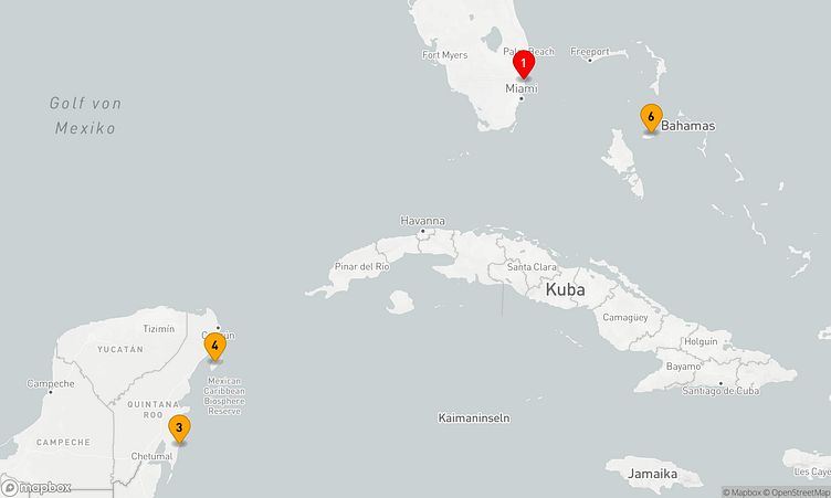 Während der Route halten Sie unter anderem in den Häfen von Fort Lauderdale, Puerto Costa Maya Mahahual und Nassau, um in das Flair und die Besonderheiten der Umgebung einzutauchen.