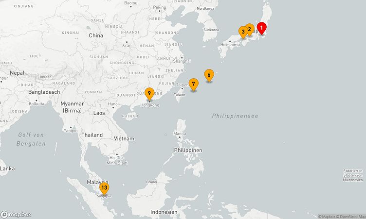 Auf der Route besuchen Sie unter anderem die Häfen von Tokyo (Yokohama), Nagoya und Okinawa, um das besondere Flair und die Einzigartigkeit der jeweiligen Orte zu erleben.