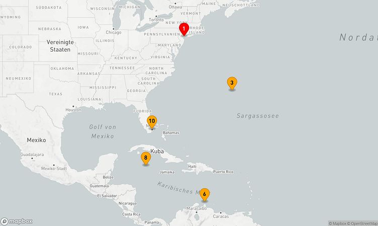 Auf Ihrer Route erwarten Sie interessante Häfen wie New York City, Kings Wharf und George Town, wo spannende Land und Kultur erleben auf Sie warten.