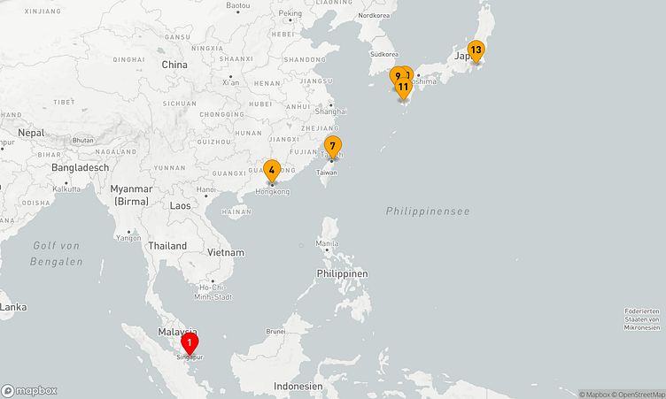 Auf dieser Route erwarten Sie Stopps in den Häfen von Singapur, Hongkong und Keelung, wo Sie lokale Highlights entdecken und beeindruckende Eindrücke sammeln können.
