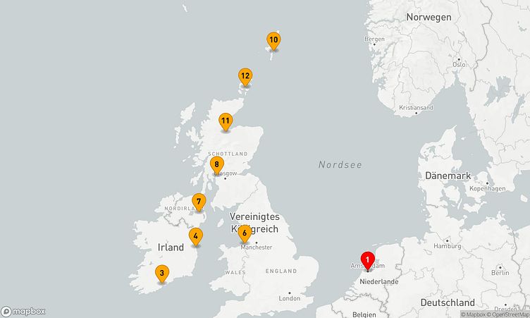 Auf dieser Reise erwarten Sie Stopps in den Häfen von Amsterdam, Dublin Dun Laoghaire und Glasgow (Greenock), wo Sie lokale Highlights und unvergessliche Eindrücke sammeln.