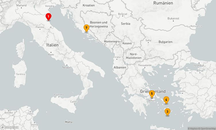 Freuen Sie sich auf Anläufe in Häfen wie Ravenna, Santorin und Athen (Piräus), die Ihnen authentische Einblicke und besondere Erlebnisse bieten.