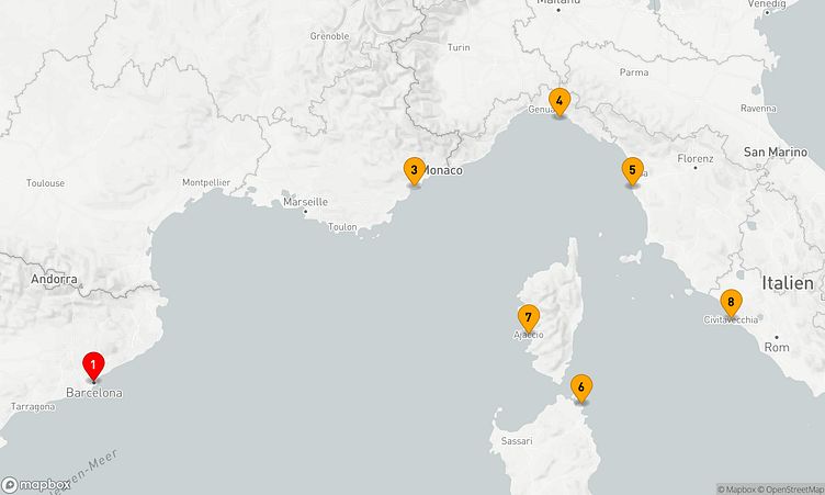 Während der Route besuchen Sie unter anderem die Häfen von Barcelona, Cannes und Livorno, um das besondere Flair und die Highlights der Region zu entdecken.